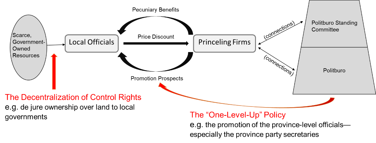 地方官员拥有对稀缺资源和国有资源的控制权,他们提供价格折扣,给这些与政治局常委或政治局委员有联系的公司,并且能从对方手中获得金钱收益(彻底腐败)或是晋升预期。