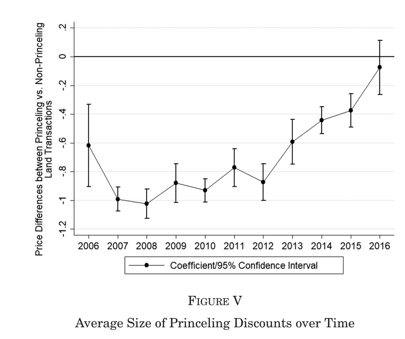 结果表明“中央检查”和“由领导人任命的官员”更加有效,价格折扣分别显著降低了42.6%(exp(-0.858+0.695)-exp(-0.858)=0.426)(4)和31.5%(exp(-0.896+0.572)-exp(-0.896)=0.315)(6)。Figure V概括了一段时间内“高层政治关联”公司获得平均折扣的大小,显示了在反腐运动之后,折扣明显收缩,到2016年基本消失。