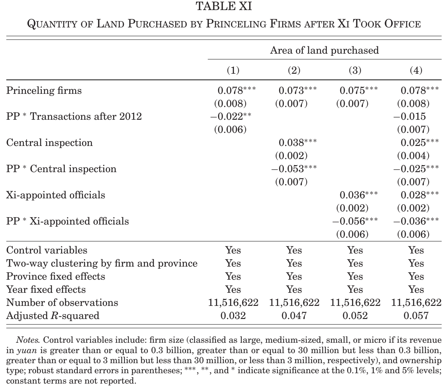 Table XI显示:反腐运动对“高层政治关联”公司购买土地数量产生的下行压力。同样地,后两种措施显得更加有效。
