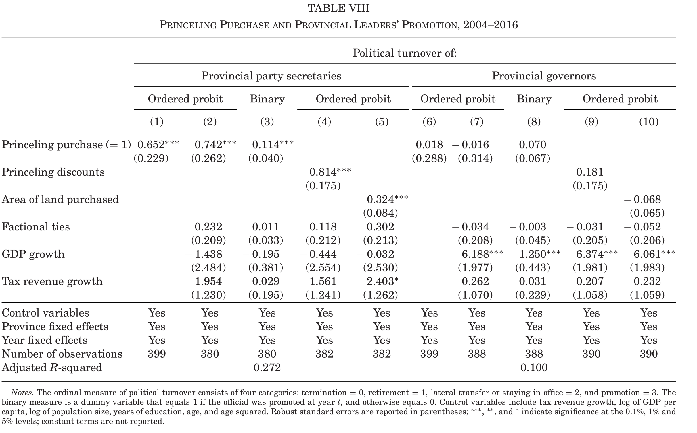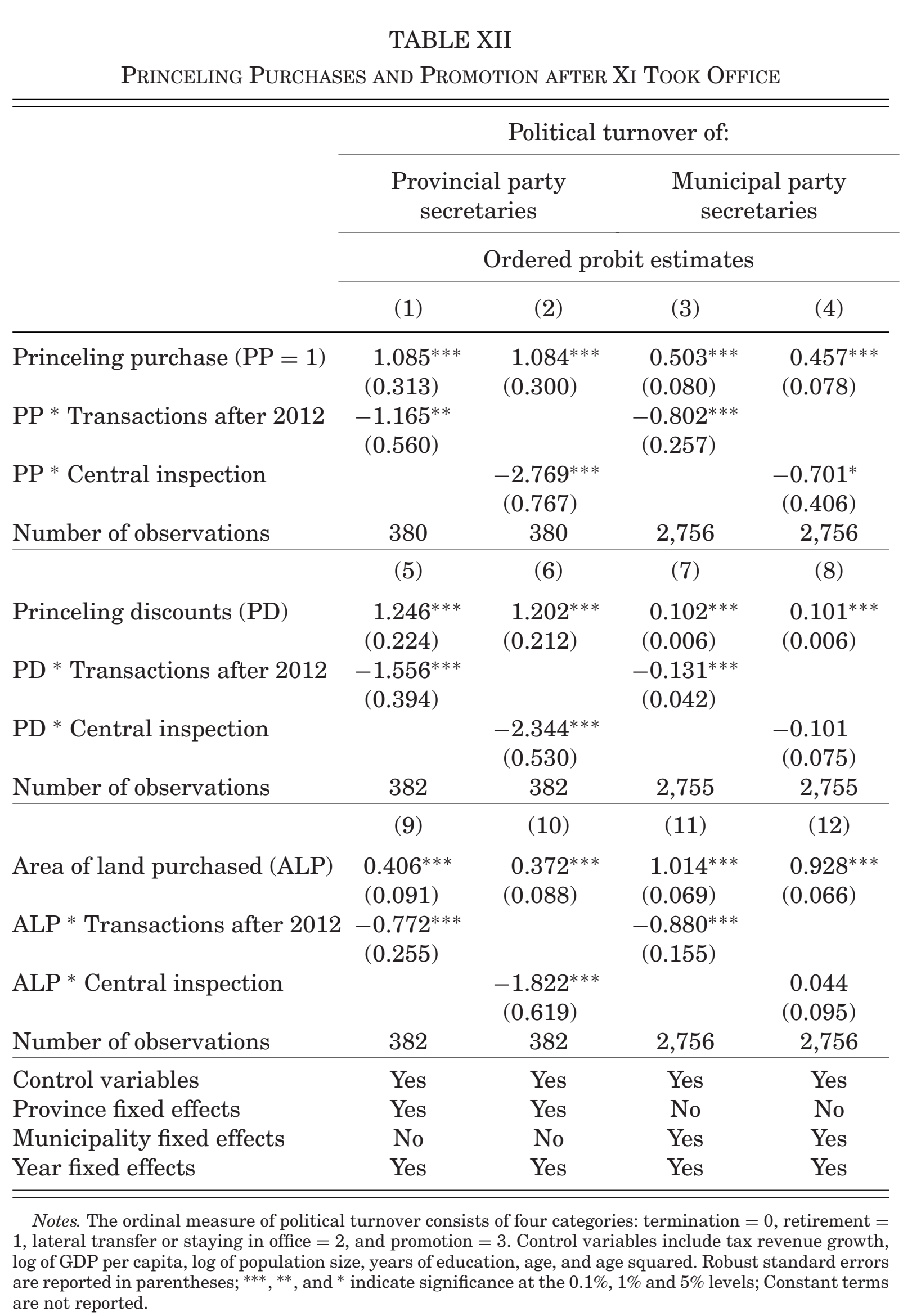 与估计一致,Table XII显示了反腐败运动降低了这些依赖提供折扣的地方官员的晋升预期。