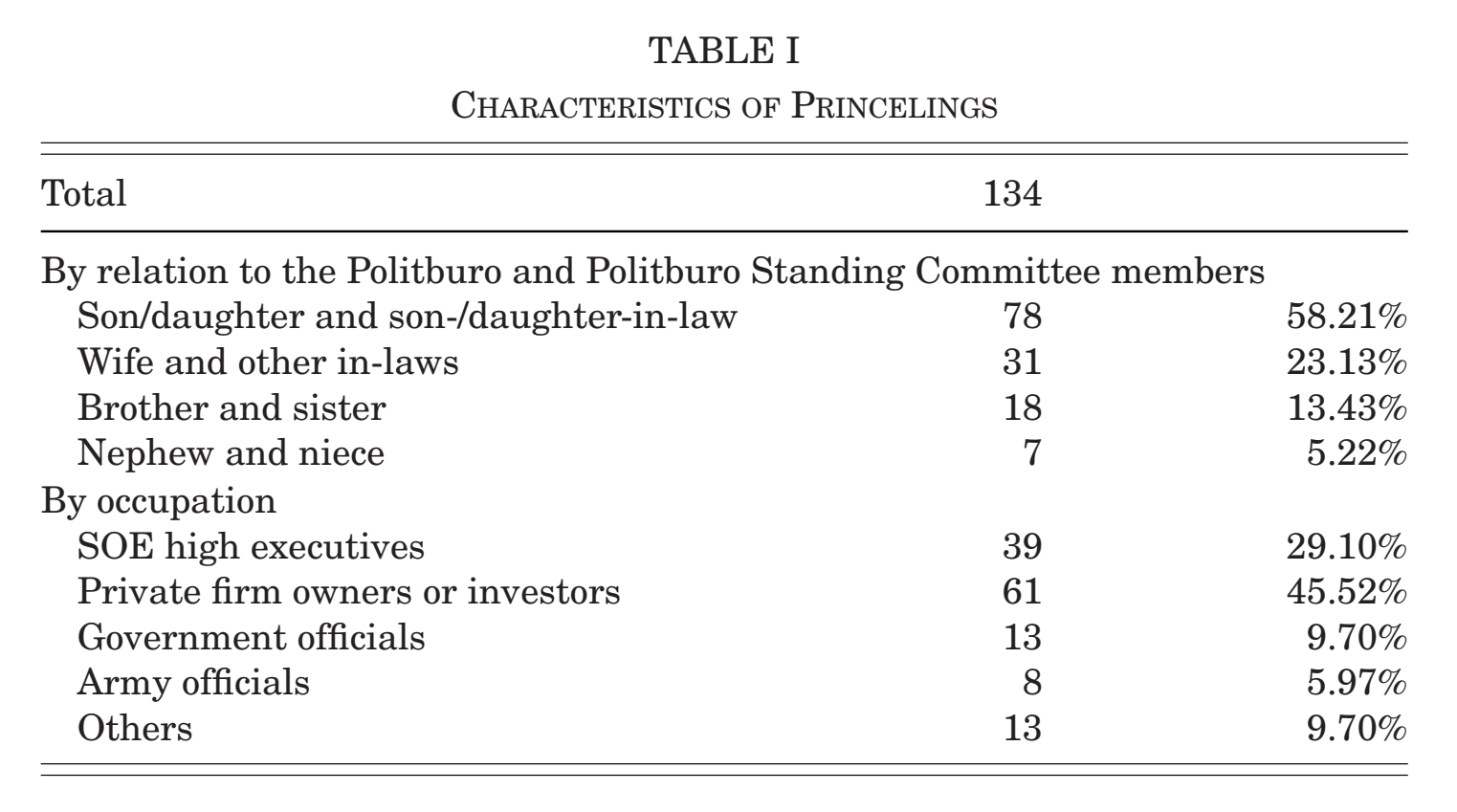 在64名政治局成员中,选择48名,通过丰富的线上媒体资源,找到与其相关的134位具有“高层政治关联”的对象。其中,样本中大约58.21%政治局委员的子女或姻亲,将近一半(45.52%)属于私营部门。这些关系的紧密度让我们对数据的可靠性产生信心。