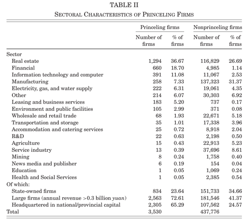 共找到3530家有“高层政治关联”的公司。大部分从事房地产、金融和租赁及商业服务行业,表明一级土地市场是一个租金可供争夺的领域。