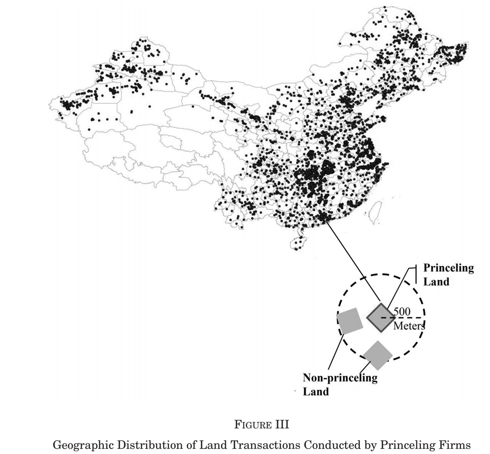 找到国土资源局官网上的数据集,包括2004到2016年中国一级土地市场上的所有土地交易数据(其中披露了每一个具体的交易细节,包括大小、位置、总付款、日期、买卖双方姓名、特定交易方法、两位的土地用途编码、土地质量(官员主观评估,20分制)、三位购买者公司编码)。将以上获得的“高层政治关联”对象名单和土地交易数据进行匹配,共找到这段期间内“高层政治关联”公司购买的19812块土地,地理分布如Figure III所示。