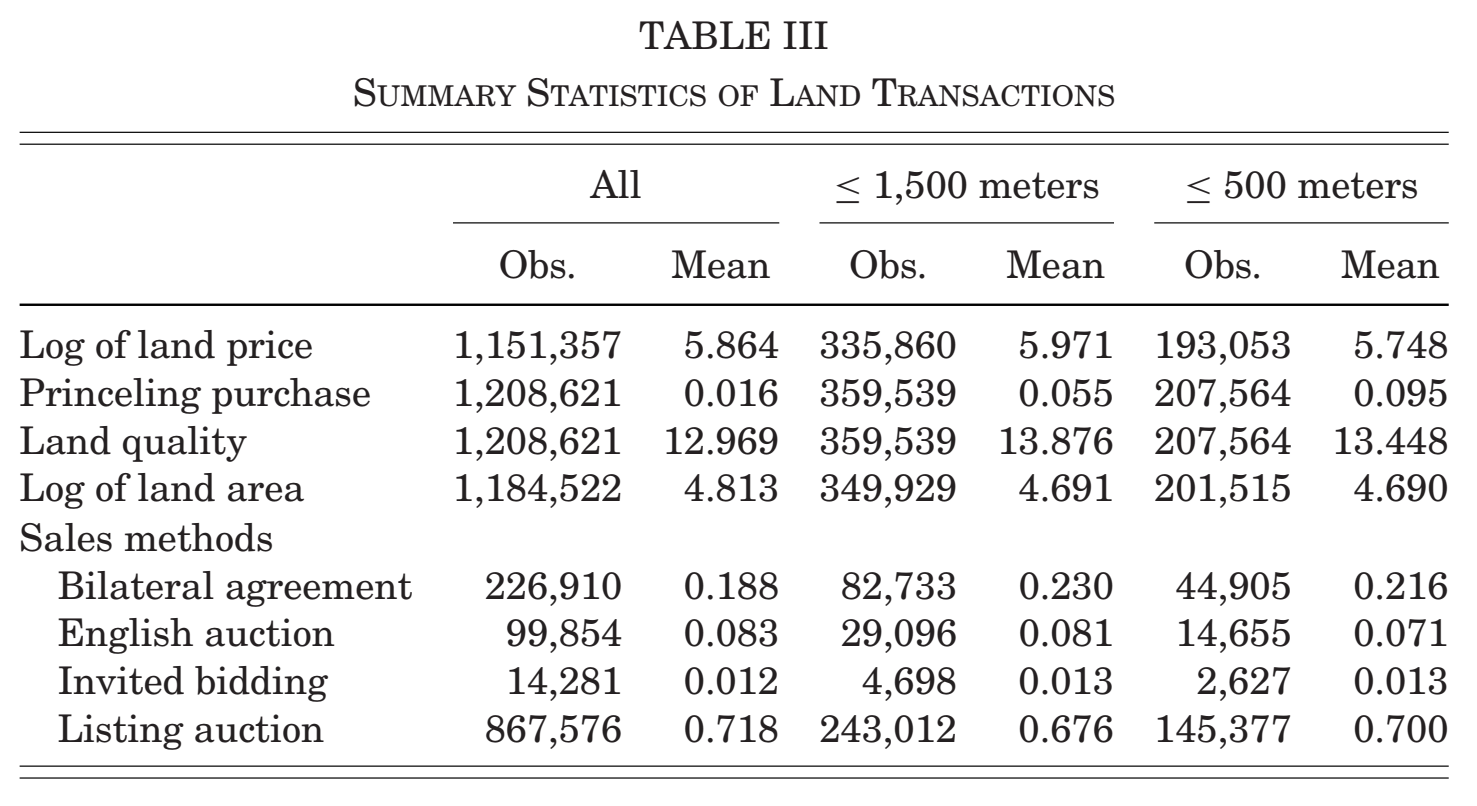 控制变量:包括销售土地面积的对数、土地质量、交易方法、公司规模及公司所有权等。