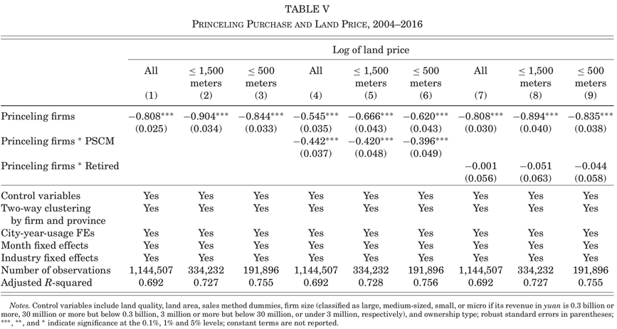 另外,为防止虚拟变量PrincelingPurchasept缺少由地方政府提供的折扣幅度信息,可以使用PrincelingDiscountspt(500m范围内“高层政治关联”公司和相对应的“无高层政治关联”公司交易价格的差值)和AreaofLandPurchasedit(出售给“高层政治关联”公司的土地数量)进行替换,以构建一个更精确的测量方法。