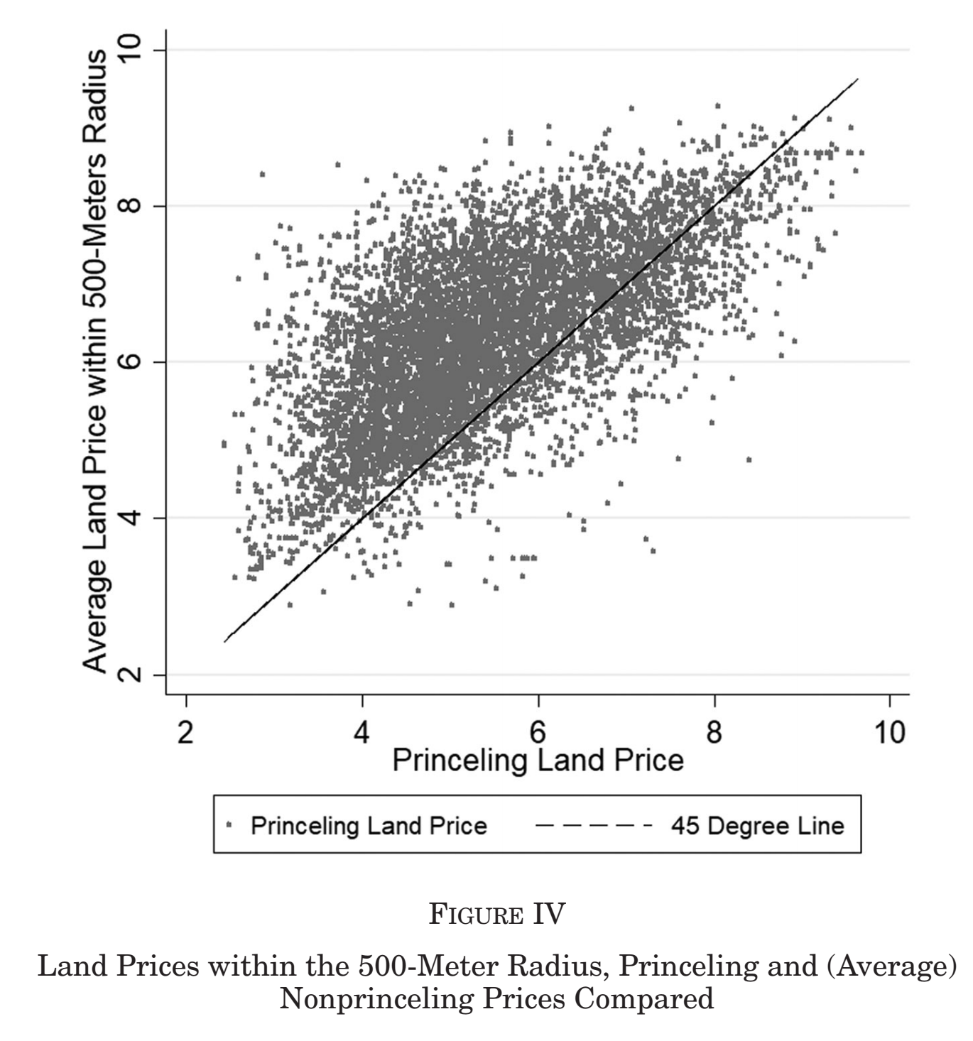 假设在同一地区和同年出售同样大小的土地在质量和价格上具有高度可比性,为了确保同类比较,生成一个在同年和相同距离内由“无高层政治关联”公司购买的土地交易样本。例如,500m半径内(3块),1500m半径内(8块)。总共能挑选出由“无高层政治关联”公司购买的1500m半径内的359539块土地和500m半径内的207564块土地。